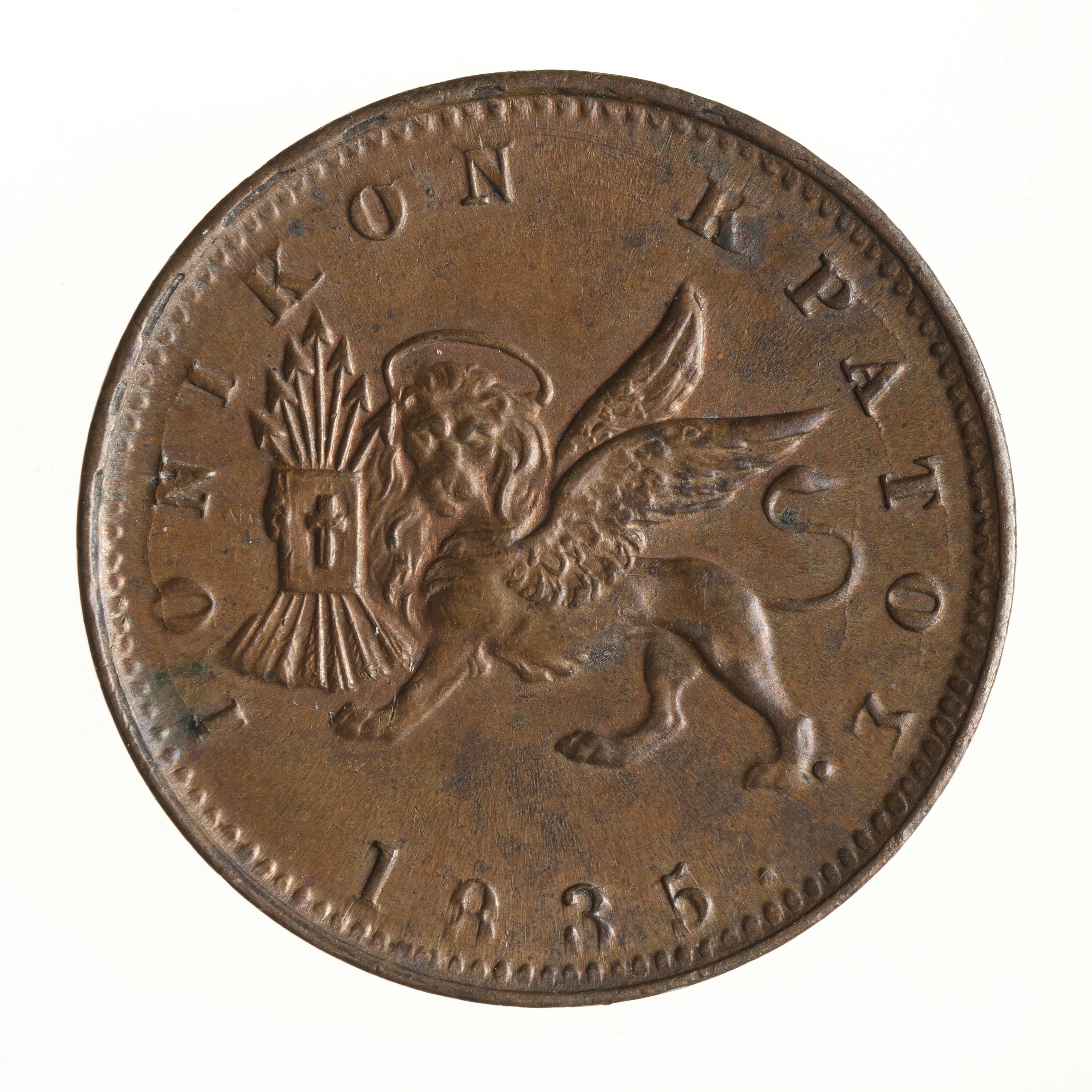Winged lion of St. Mark facing to left holding Bible and seven arrows; below, 1835.; around above in Greek, IONIKON KPATOS