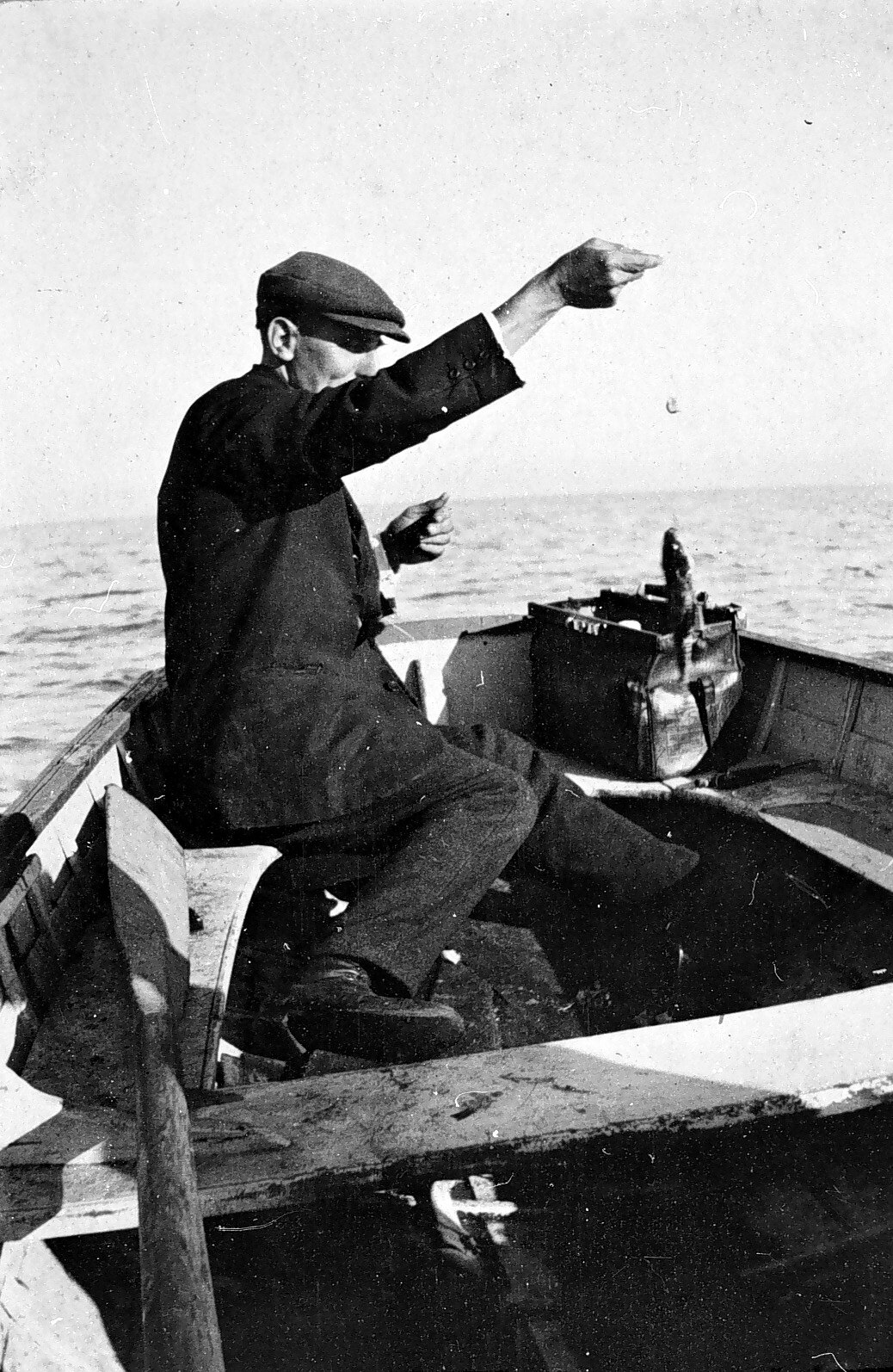 A man catching fish from a dinghy.