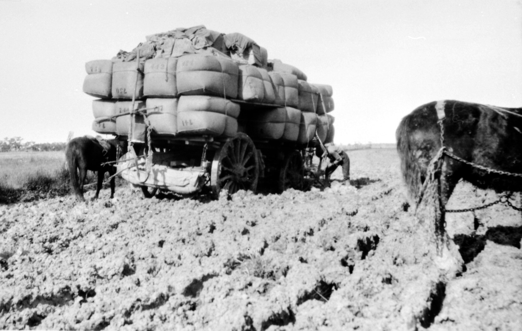 A wagon load of forty bales of wool which has bogged. There is a horse of the right and a man by the front wheel. A saddled horse is tethered to the back of the wagon. The load was being taken from Coleambally to the railway station at Morundah.