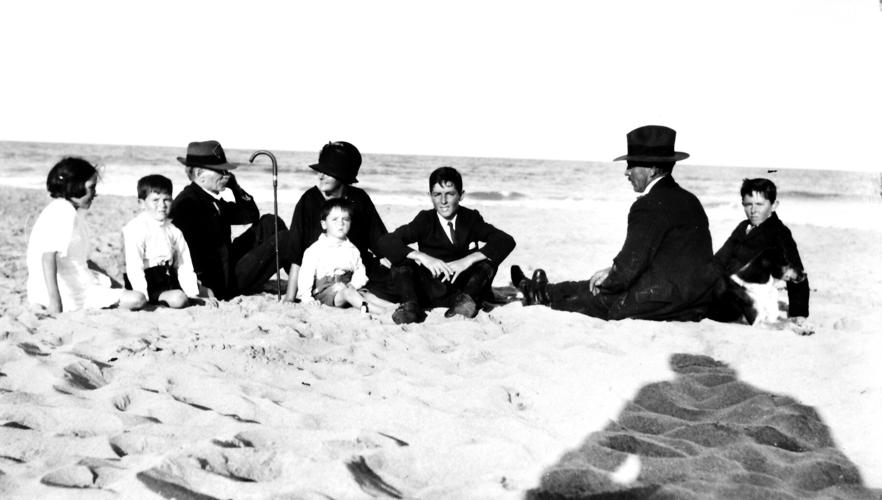 The Mills family on the beach at Thirroul. They are seated on the sand, dressed in their best clothes.