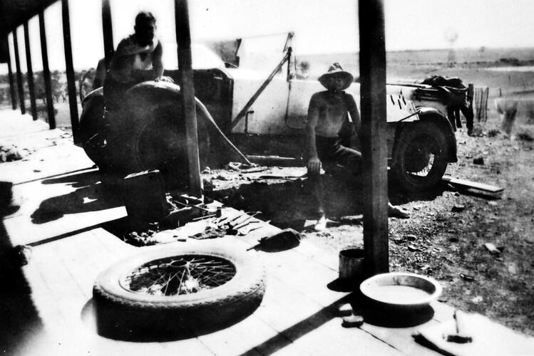 Two shearers repairing a Vauxhall car by the verandah of a building. There is a wheel in the foreground and a number of tools on the edge of the verandah. They are on 'Warbreccan' station.