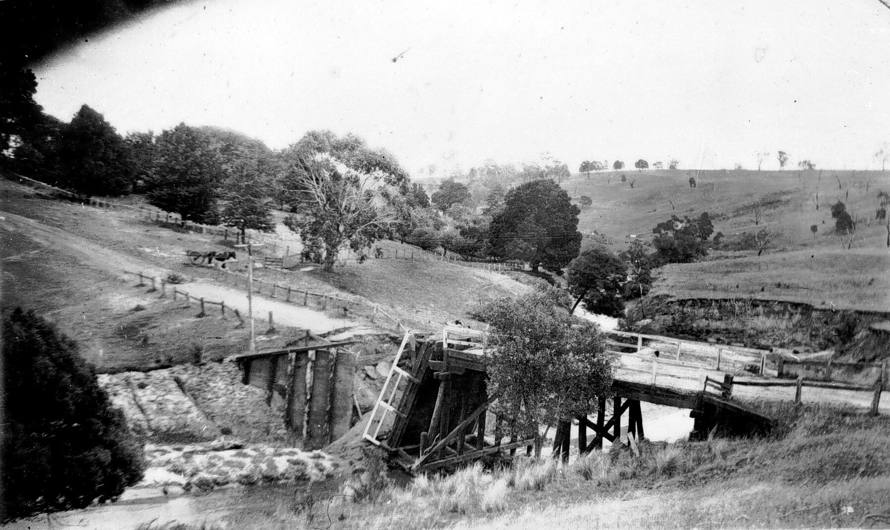 A collapsed bridge over the Wando River on the Coleraine-Nareen Rd, justt below the 'Wando Dale' homestead. A load of wool had crossed the bridge immediately prior to the collapse.