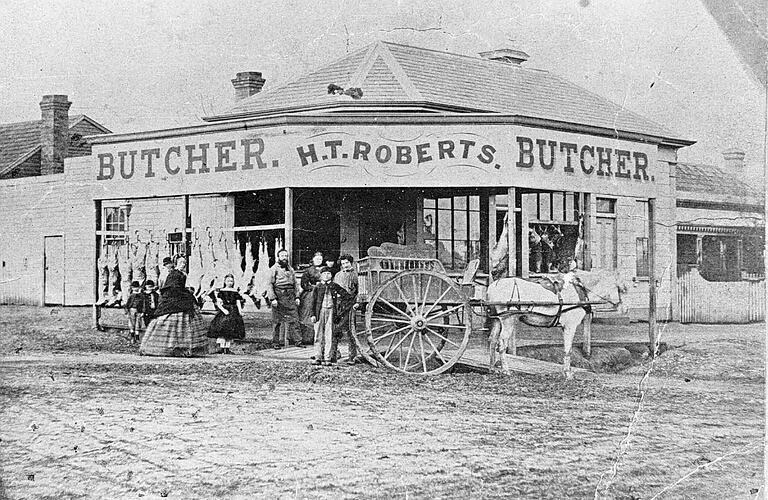 H.T.Roberts, Butcher with carcasses hanging outside the shop. There is a horse and cart in front of the shop. There is a grinding works on the left. There are also women and children standing in front of the store, one woman is wearing a dress with a bustle.