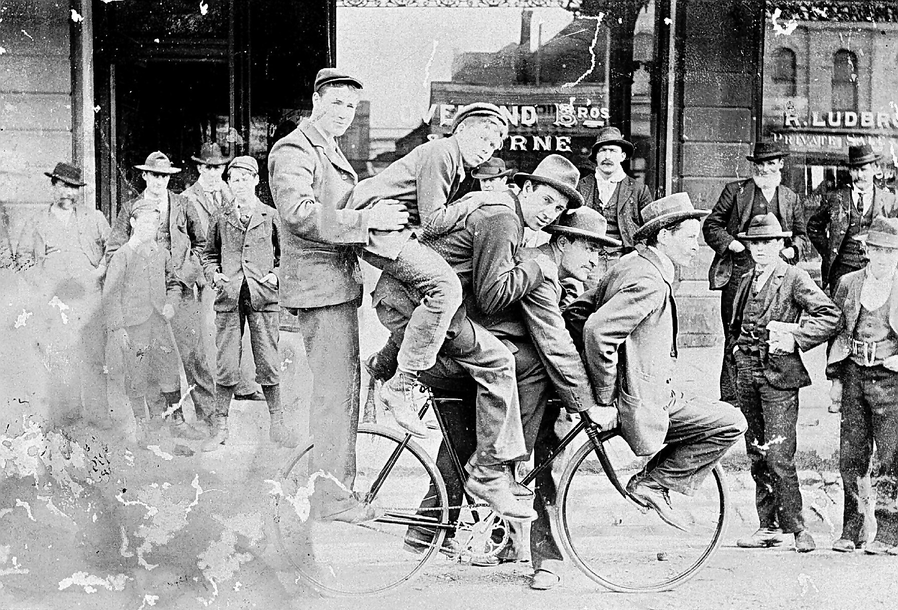 Five men on the one bicycle in front of Loveland Brothers (bicycle manufacturers). A number of men look on.