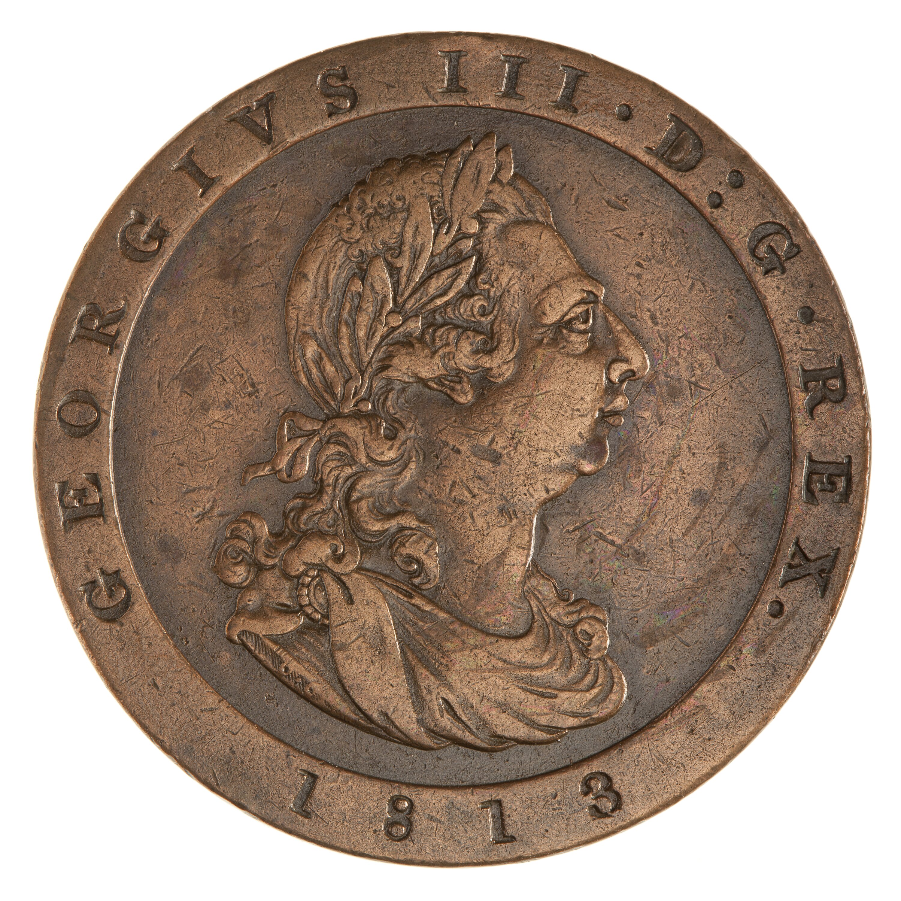 Laureate and draped bust of the king facing right; around incuse on broad raised rim, GEORGIVS III. D: G. REX. 1813