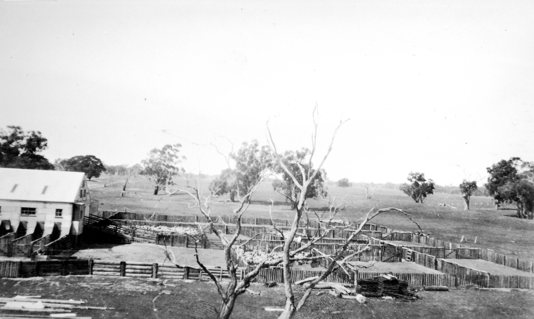 A shearing shed on the left There are a number of sheep yards with sheep in two.