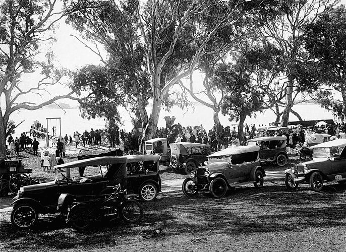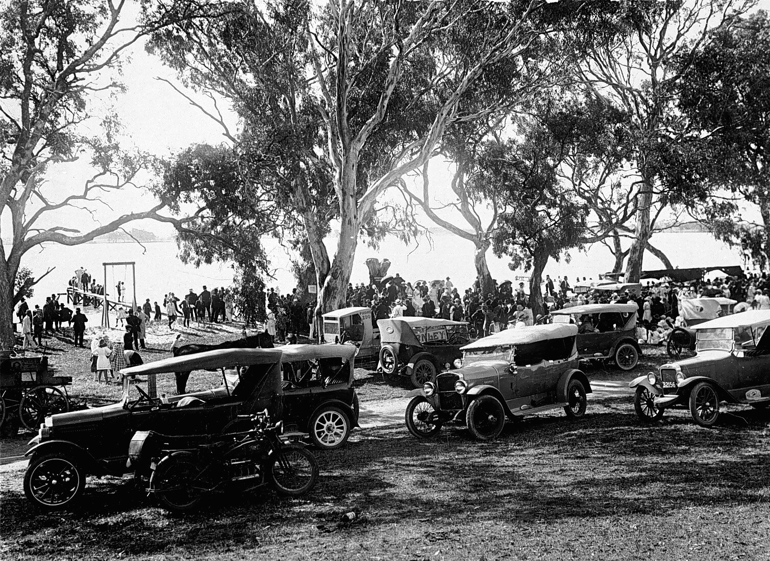 A crowd of people and cars beside a lake for the 'Back to Natimuk' celebrations.