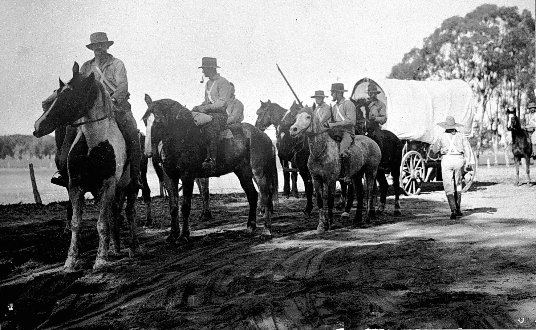 A re-enactment at the centenary of major Mitchell 's expedition. Horses are pulling a German wagon.