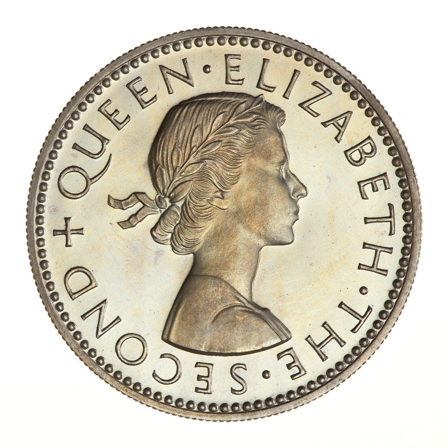 Laureate bust of the Queen facing right; around, QUEEN ELIZABETH THE SECOND; artist's initials, MG, incuse on bust truncation