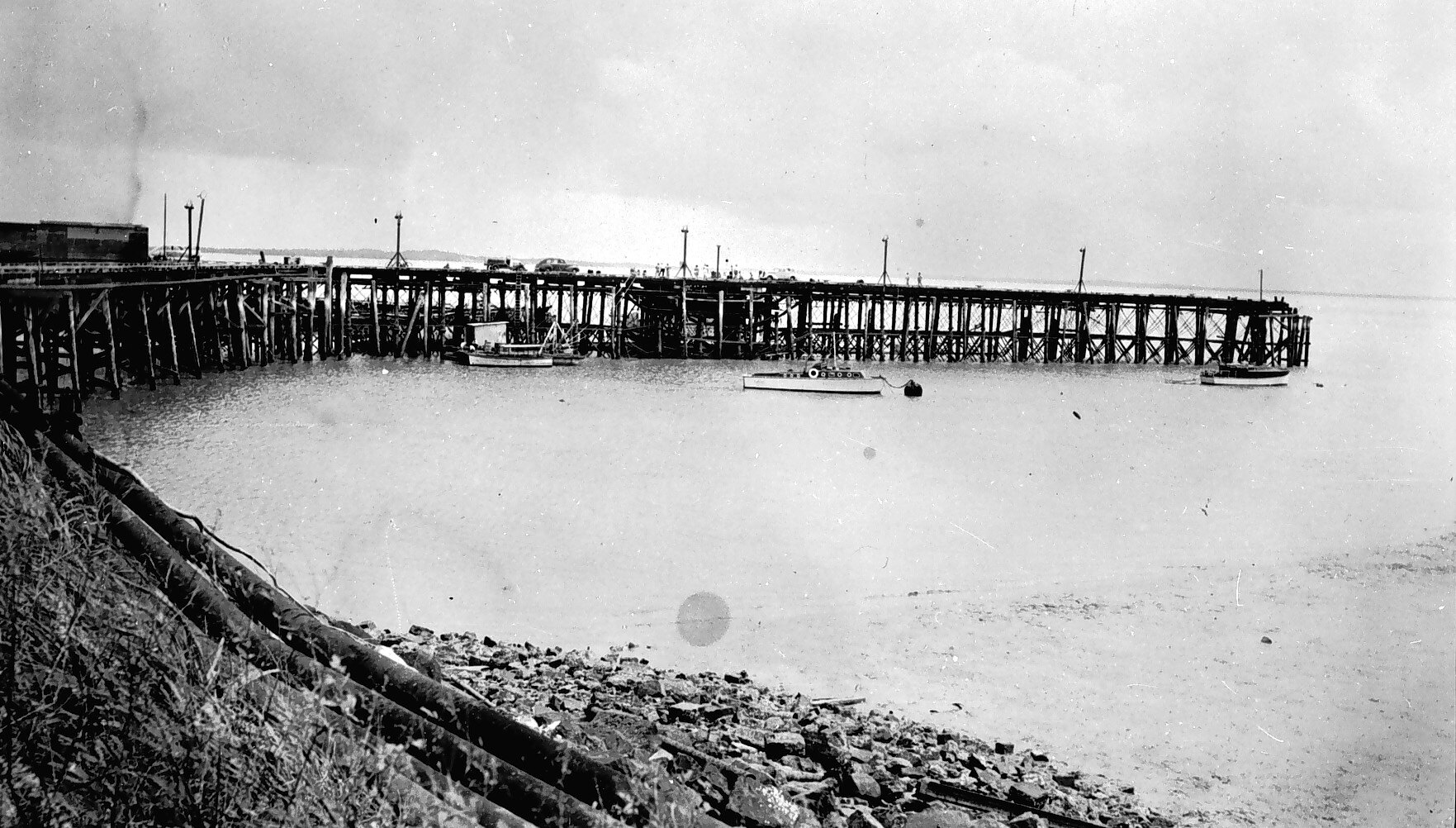 Stokes Hill Wharf, Darwin, at low tide. The hulk of the MV Neptuna is visible through the wharf pylons on the left Below the cars and people on the wharf is a British submarine, which was visiting Darwin en route to Hong Kong.