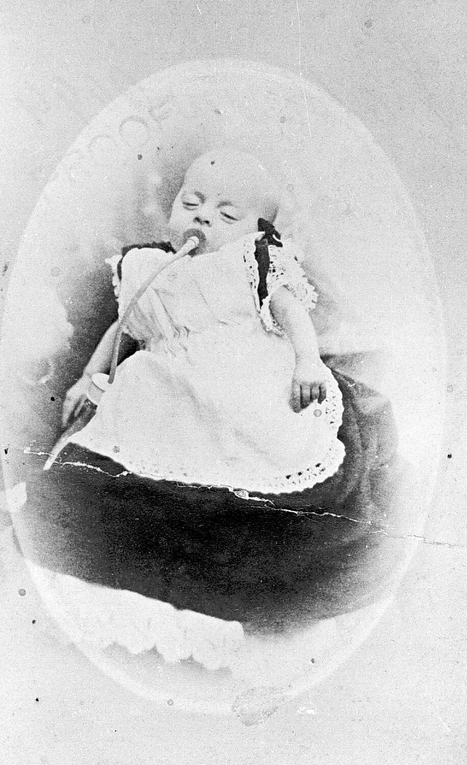 A baby in a frilled dress sucking on a long tube attached to a bottle which is propped beside her/him.