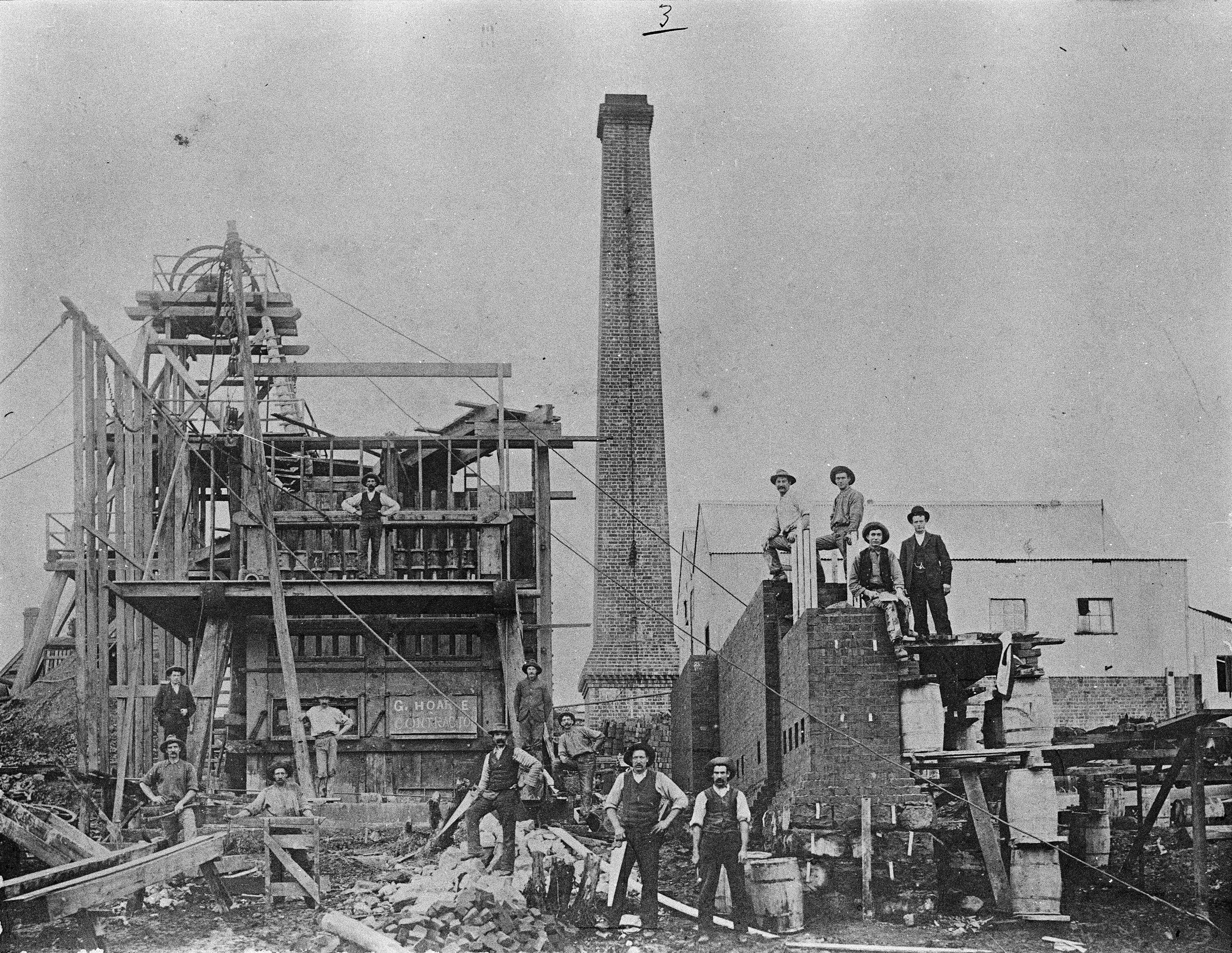 Mining battery under construction at North Woah Harp Gold Mine. There is a large chimney in the centre of the image. The workers are wearing vests, hats and trousers. There are many barrels around the site, several are being used for scaffolding.