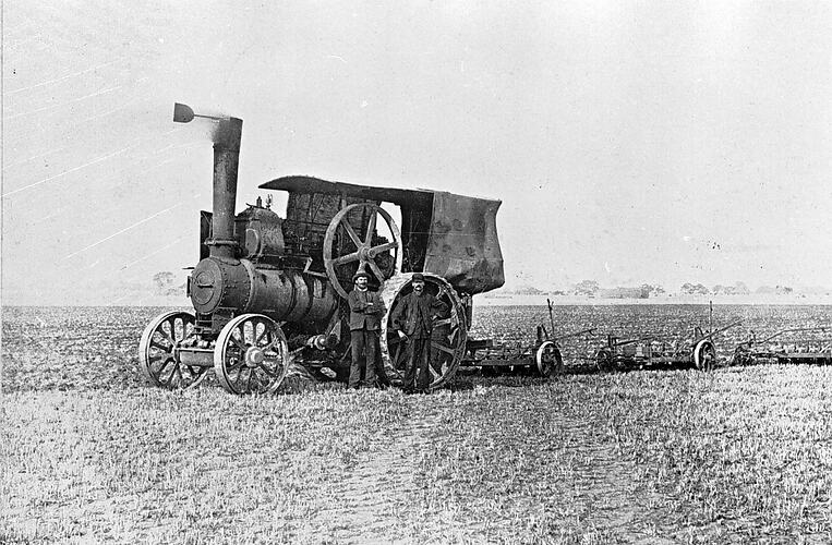 Steam traction engine (Aveling & Porter?) pulling three ploughs. There are two men standing in front of the engine, they are wearing hats, trousers and jackets. There are many trees in the distance.