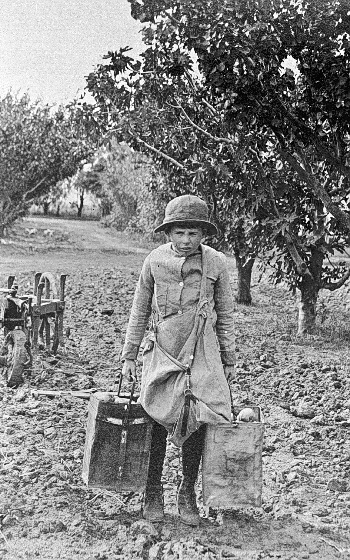 A boy carrying buckets of fruit through an orchard.