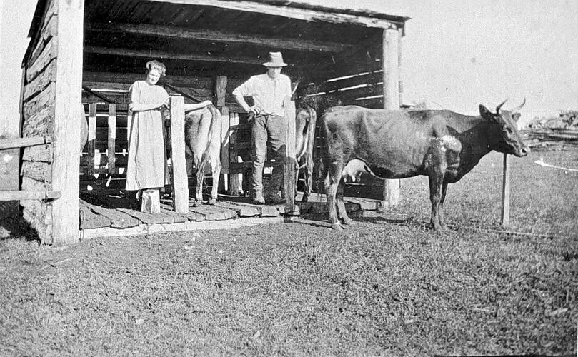 Photograph of Mrs and Mrs Lockett in a milking shed, Neerim North, Victoria, around 1925. A cow stands in front of them.