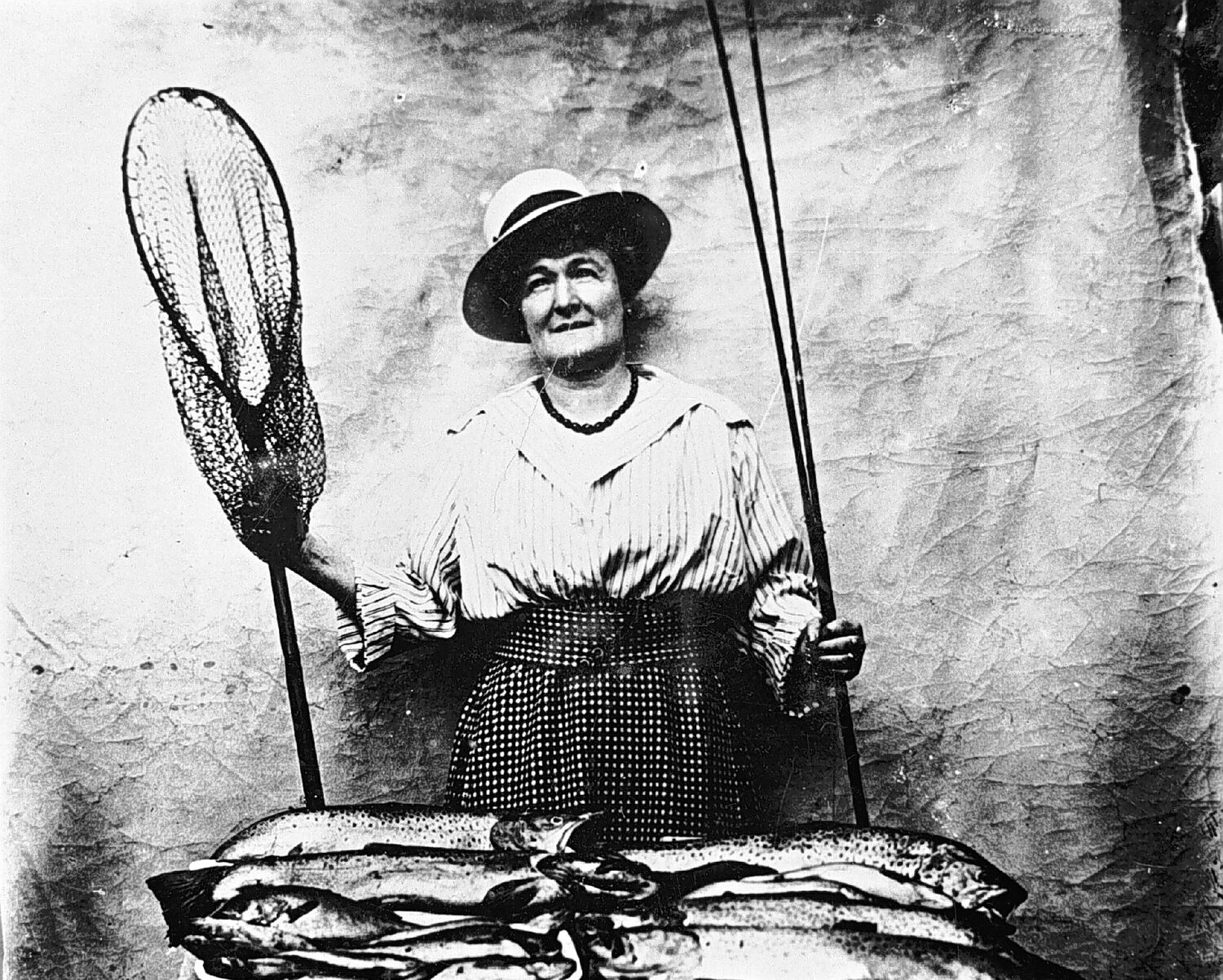 A woman with a fishing rod and net displaying a large catch of fish from Lake Wendouree.