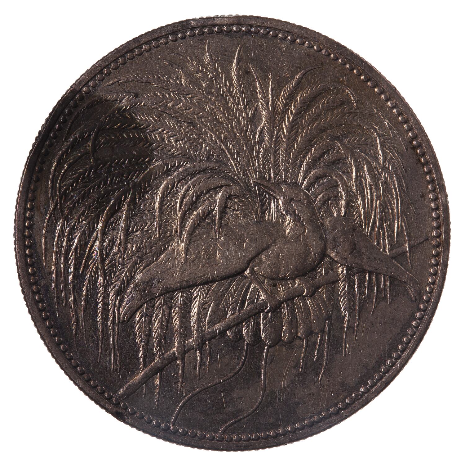 Silver 5 Marks coin issued by the German New Guinea Company. Struck at the Berlin mint, Germany. This coin was issued by the German New Guinea Company. This was a Chartered Company which had been formed in 1884 in Berlin to colonise and profit from north-eastern New Guinea. It had found it necessary to import workers from Java (who wanted payment in Dutch guilders), China and Japan (who wanted payment in Mexican dollars, a standard trad coin in Asia at that time). German, and to a lesser extent British coins was also in use in the area. To simplify this situation the Company sought permission to strike its own coins in 1891. Permission was not granted until 1894 with the stipulation that each denomination (excluding the bronze) was to match it's German Imperial equivalent. The coins were not however to bear the head of the German Emperor nor the German Eagle - they were the issue of the Company. The dies were prepared (engraved by Emil Weigand) and coins struck at the Berlin Mint. When they arrived in New Guinea all non German coins were withdrawn from circulation (the German 3 Mark and 20 Pfennig denominations were also excluded from circulation). No further production of coins was required as administration of the region was handed to the German Imperial Government in 1899, with German Imperial coins being imported. The Company coins ceased to be legal tender after 15 April 1911.