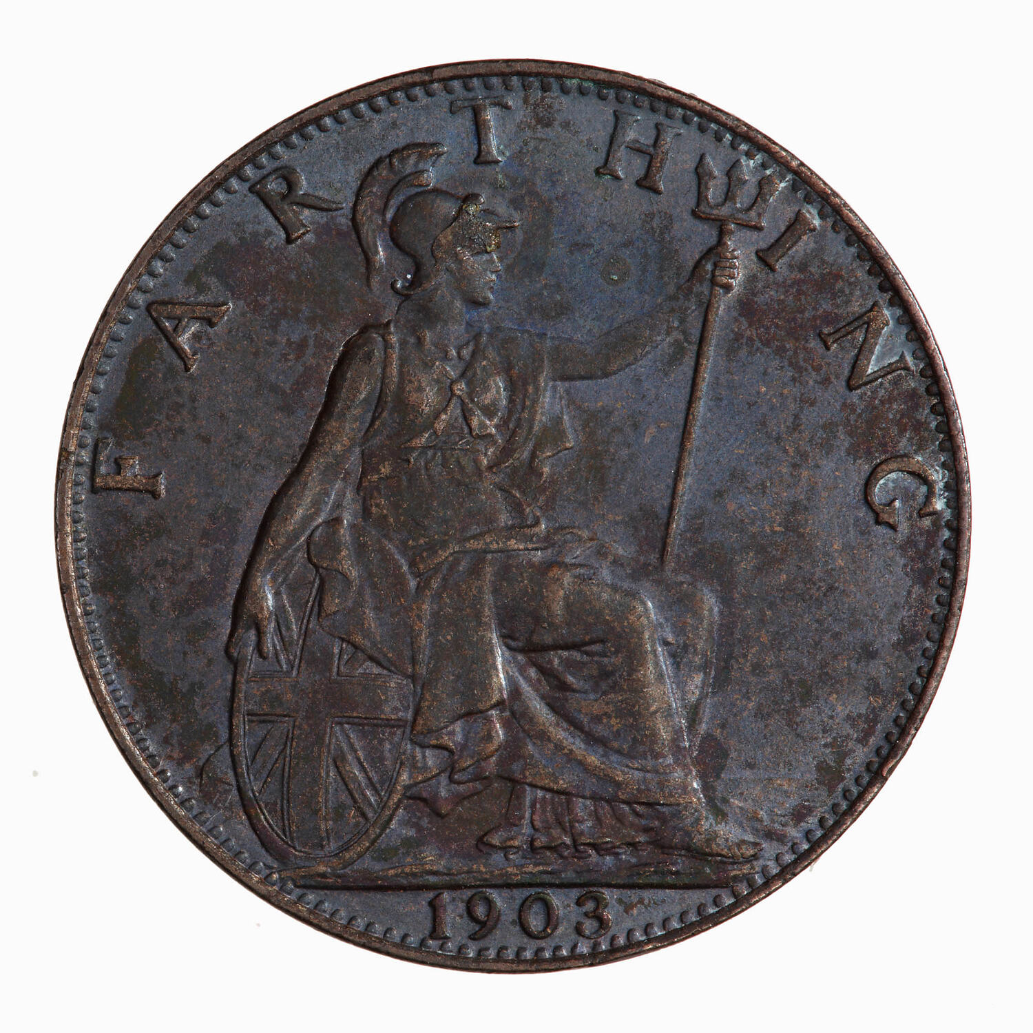 Britannia seated facing right on a rock wearing a helmet and flowing robes; she holds a trident and rests her right hand on a shield which bears the combined crosses of the Union Flag; around, ONE PENNY; in exergue, 1903