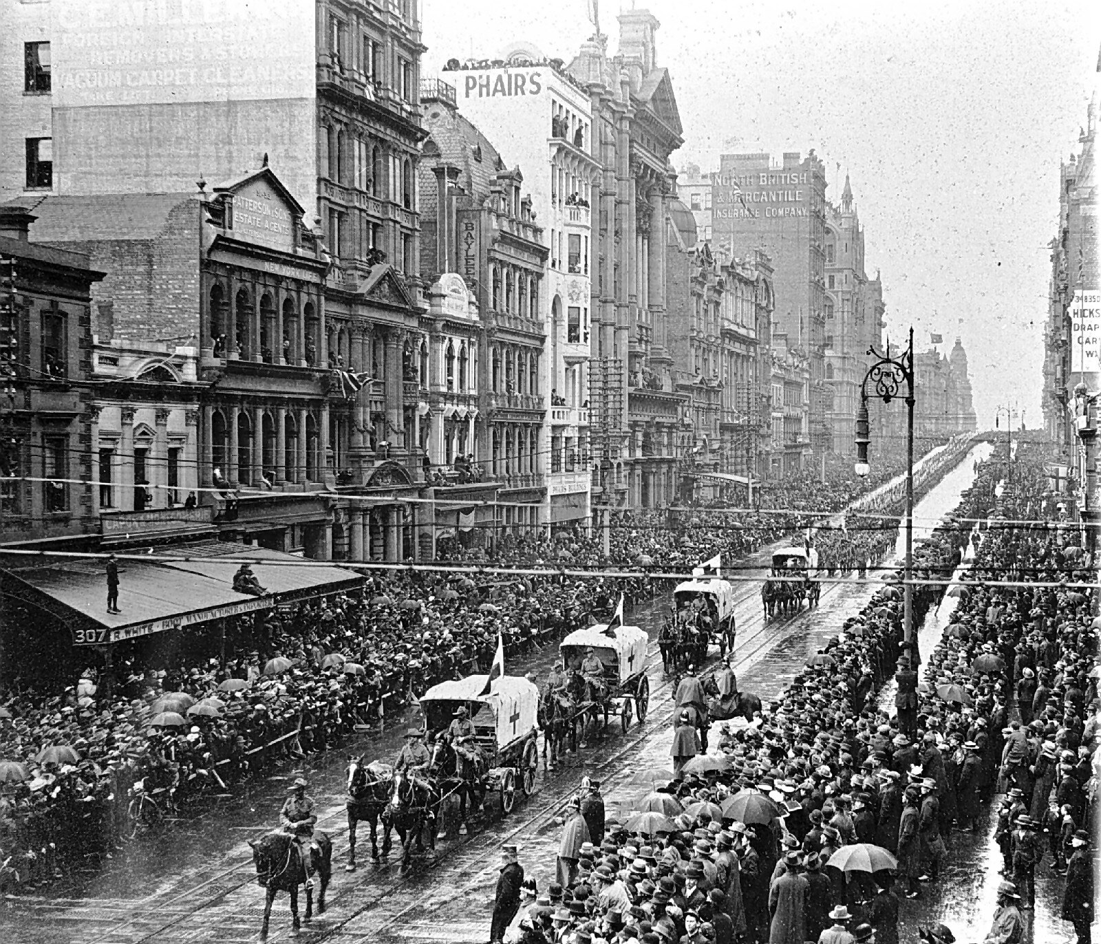 Advertising, Ceremonies, Flags, Horsedrawn Vehicles, Parades, Soldiers, Street Lighting, World War I, 1914-1918