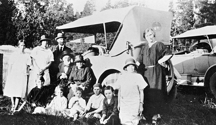 A family group at an Easter picnic, seated outside in front of their motor cars. Possibly four generations in the photograph.