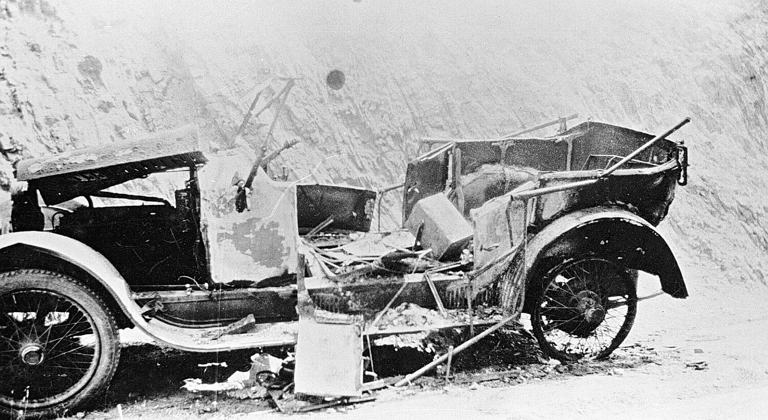 A burnt out car on the side of the road.