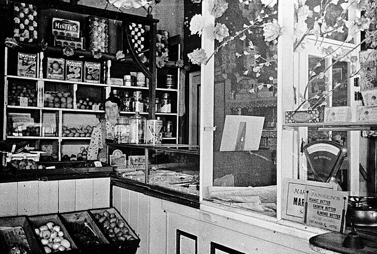 Interior of the shop shown in MM 00674. A woman is standing behind the counter with boxes of fruit on the left and an enclosed area on the right in which there is a set of scales and advertisements for butter and margarine.