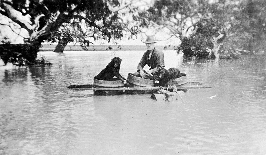 A man and two dogs on a raft which appears to have been made out of three oil drums lashed together. They are in fiery creek which is in flood.
