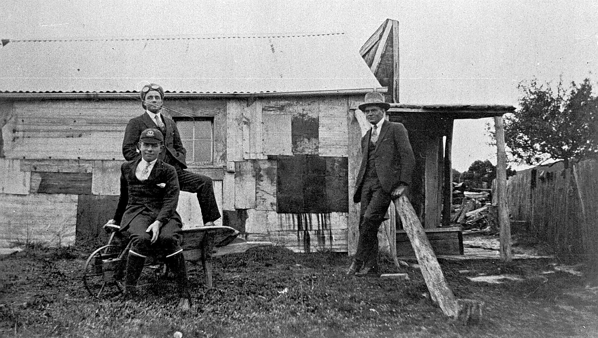 Two men and a boy outside a settler 's hut. One of the men wears goggles over a cap turned back to front .the boy is in school uniform.