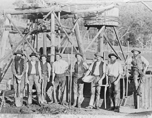 A group of miners at a mine. A whim is in the background.