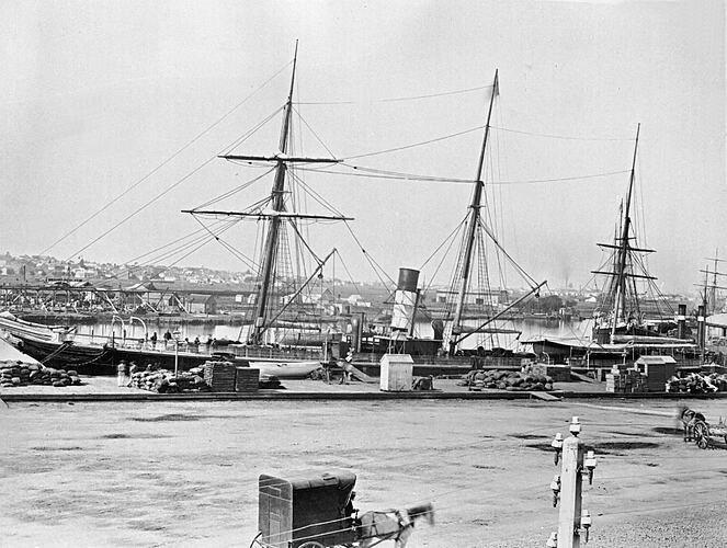 A steamship at Queen 's Wharf on the Yarra River. There is a horse-drawn van van in the foreground and a telegraph pole.