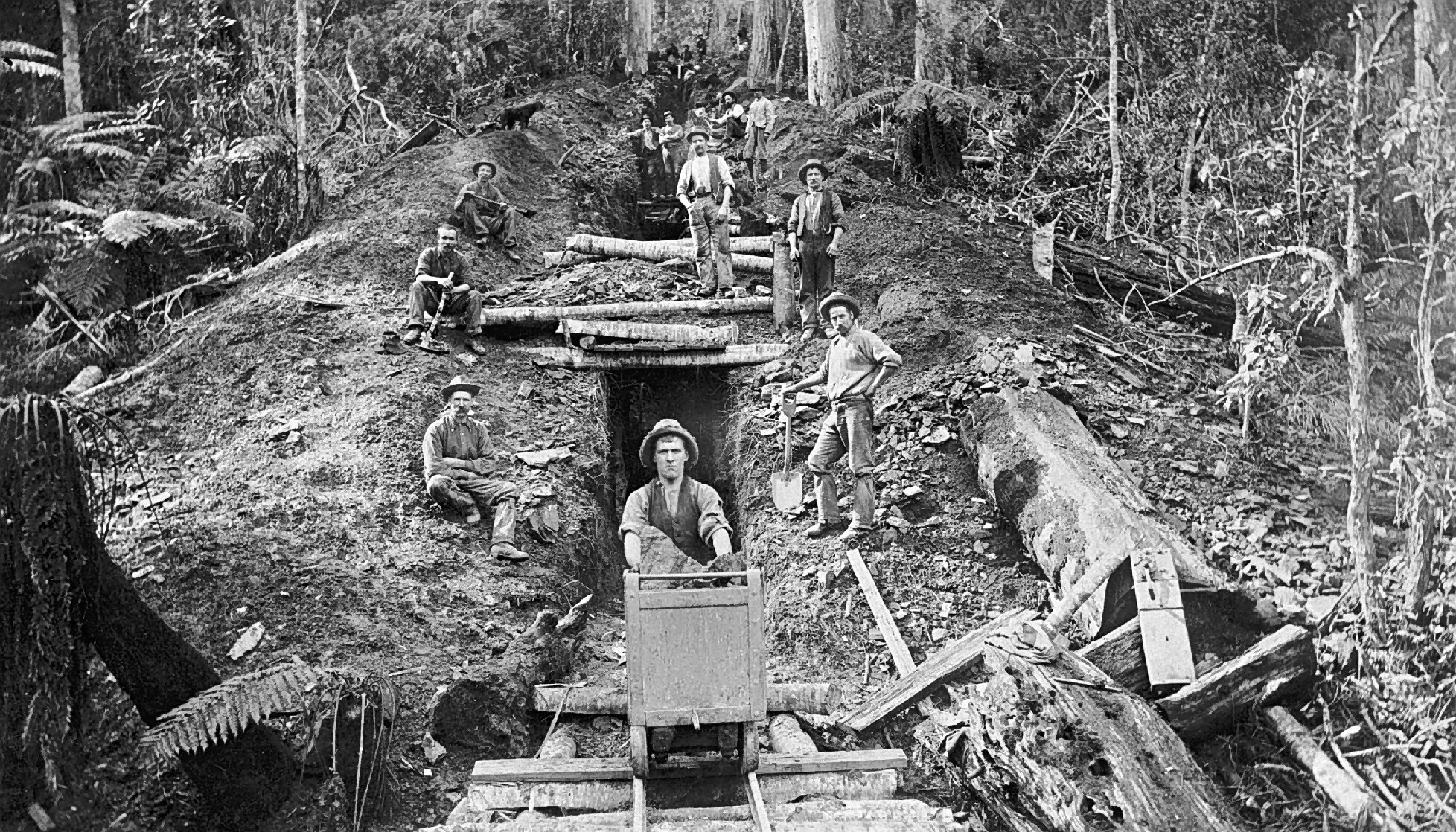 Frank Dixon and Charles Dixon with a group of miners posed around the entrance to a mine adit in a bush setting. The photo is believed to have been taken in Gippsland. At front centre a miner dressed waistcoat and hat is pushing a small mining hand truck on steel tramway rails running out of the mine entrance. Other miners in the background are posing with shovels, adzes and miner's picks. At front right an early-syle Trewhella Bros wooden bodied jack is lying on top of two large tree logs.