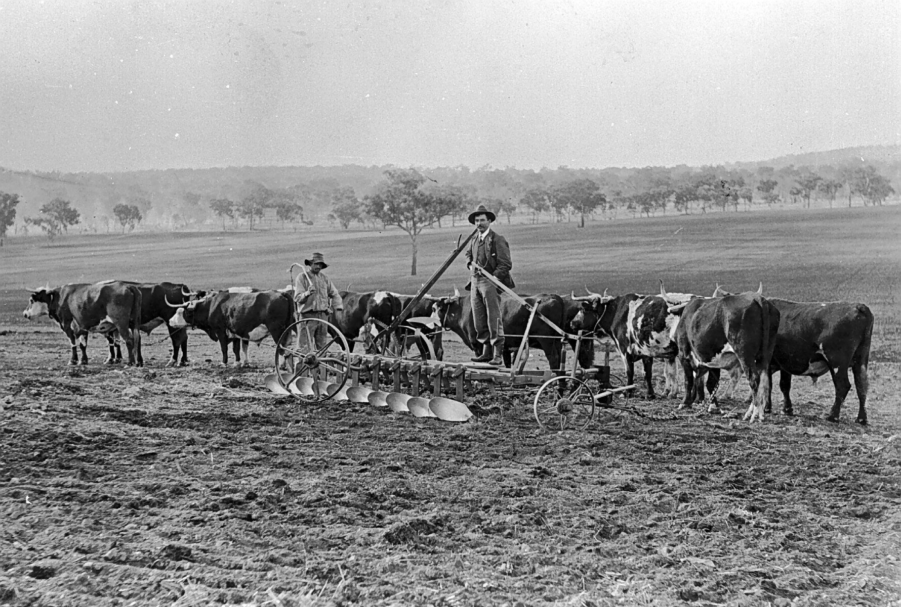 The first ploughing of virgin land by a bullock team on 'Glenwilliam' station.
