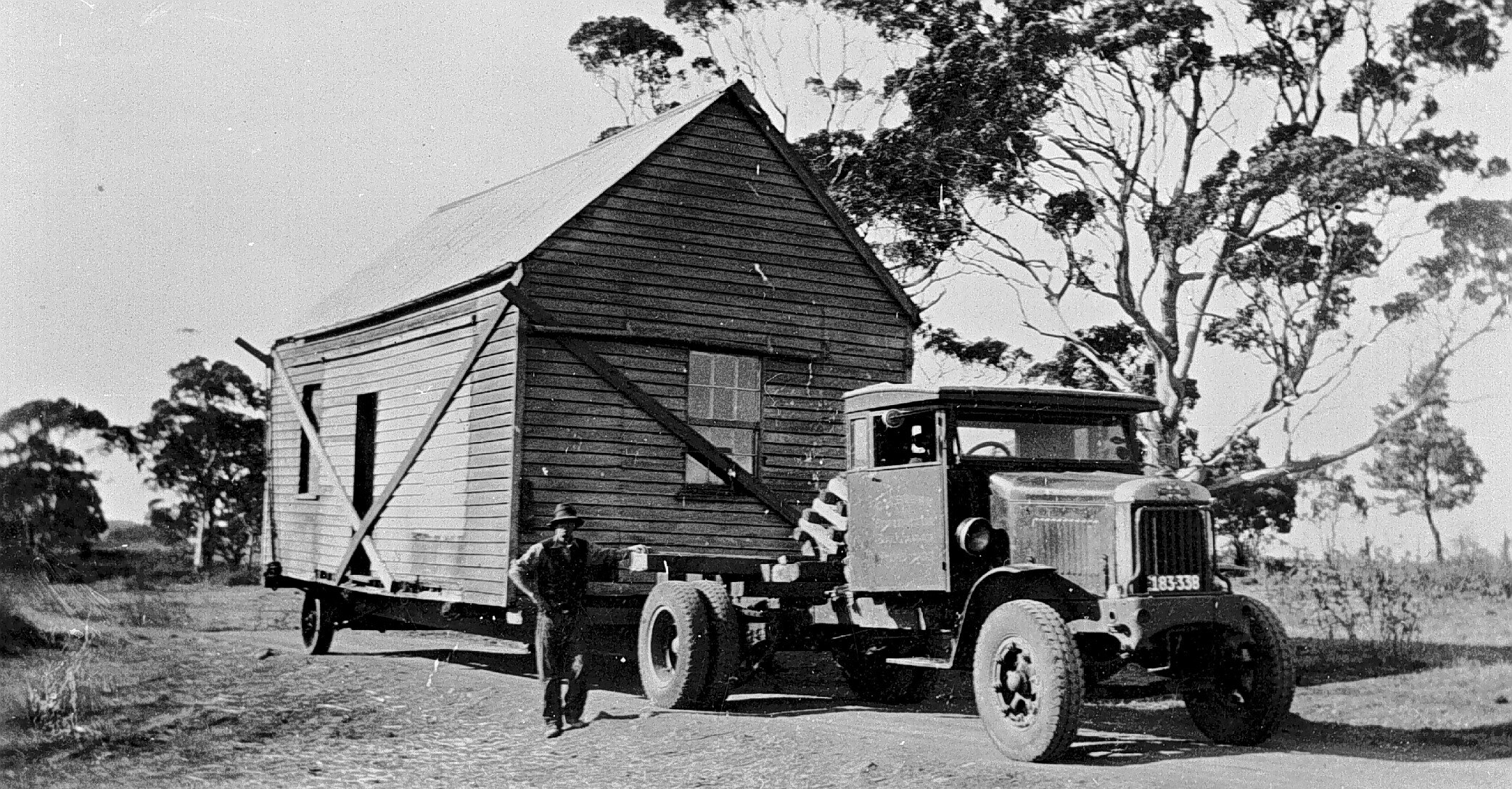 A wooden house being transported behind a truck. The house has been braced by diagonal struts.