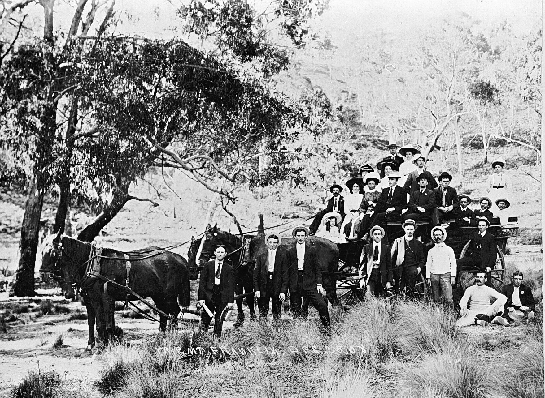 A picnic group on a horse-drawn wagon. They are travelling from Eaglehawk to Mt Franklin.
