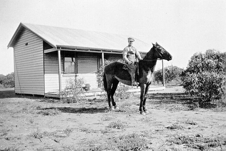A soldier settler on horseback in front of his home. This was a typical soldier settlement of the period. He is wearing some of his army uniform.