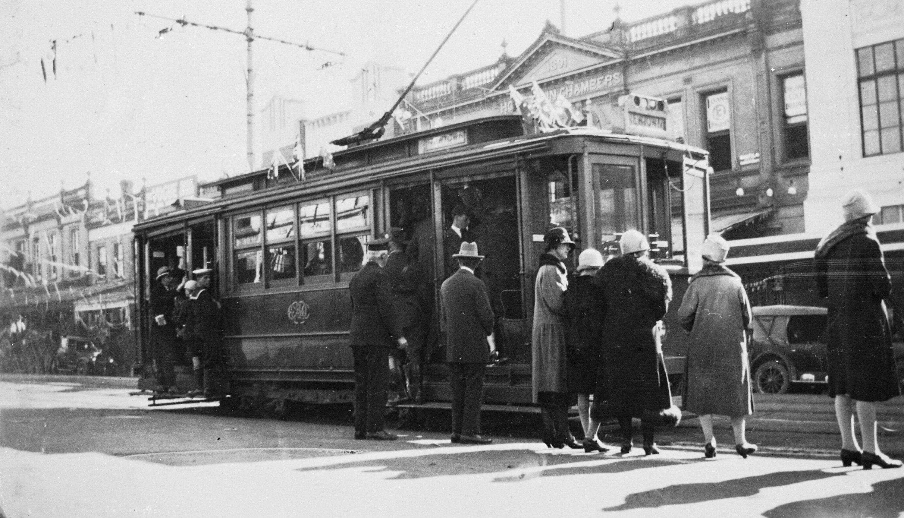 The Newtown tram decorated with flags. There is bunting on buildings in the background.