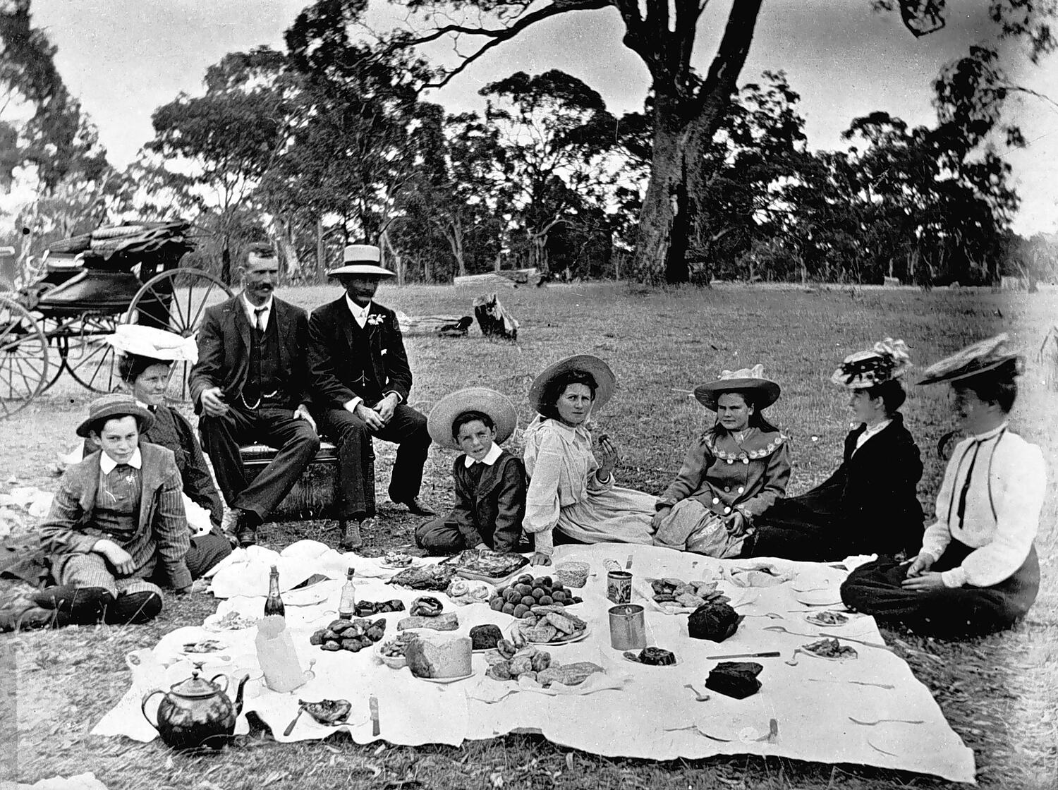 A family group at a picnic. The picnic appears to be quite formal, the family are all well dressed, there is a tablecloth spread on the ground, there are settings of plates and cutlery and an abundant supply of food. There is a buggy in the background.