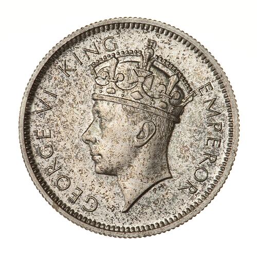 Crowned bust of the King facing left; around, GEORGE V KING EMPEROR; artist's initials, PM, below neck truncation