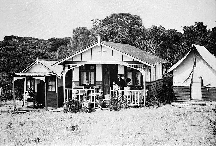 The roe family gathered on the verandah of their holiday home at sorrento. A small hut is immediately beside the larger house and a man is seated on the porch. There is also a makeshift hut with a tent roof. They are listening to the radio or gramophone.