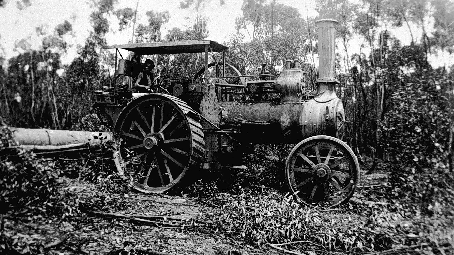 Rolling gum trees with old boiler. They are collecting eucalypts for a eucalyptus plant.