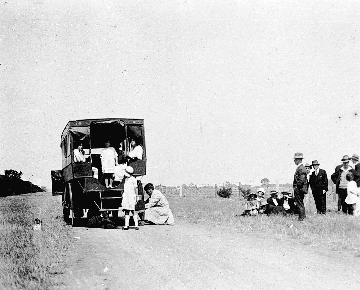 Mending a flat tyre on a charabanc. Most of the passengers watch from the side of the road. They were on their way to a Methodist picnic.