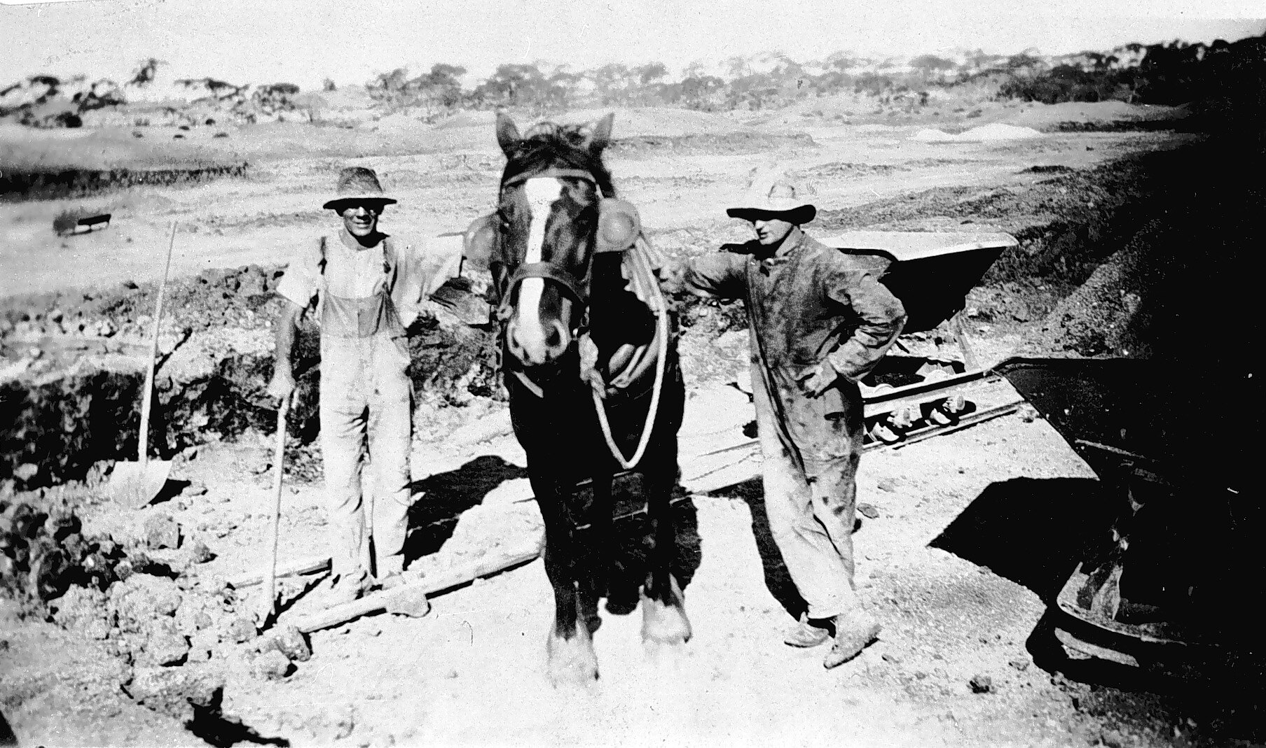 Two men and their horse at a gypsum mine.