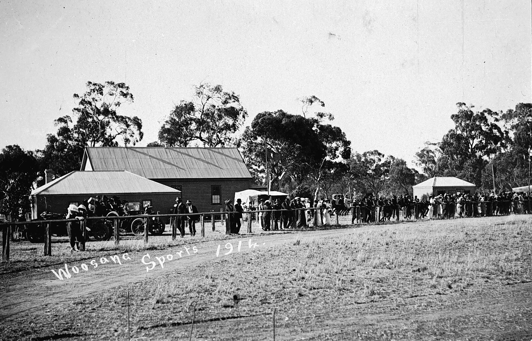 People lining the track the Woosang sports day. Woosang Hall is in the background.