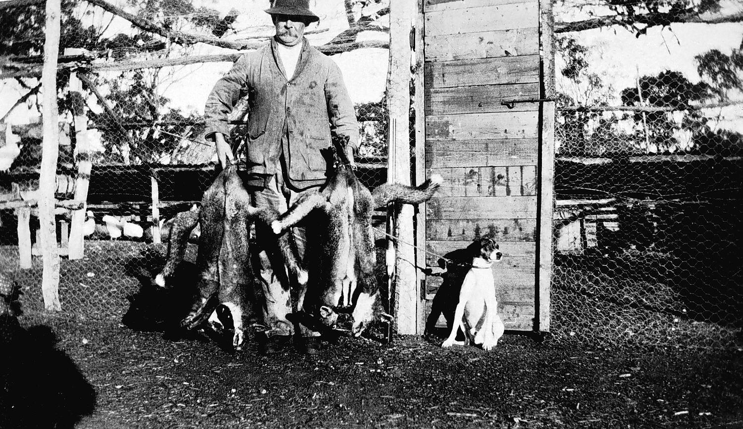 A man displaying foxes in front of fowlyards.