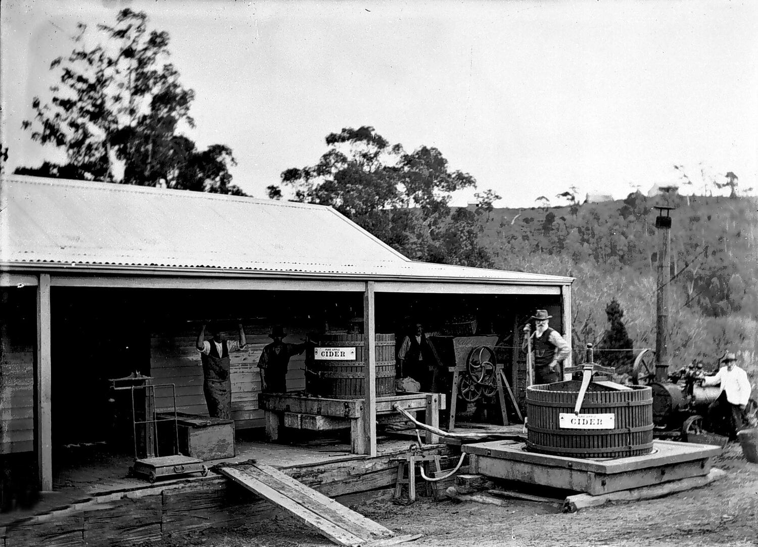 A cider factory on 'Golden Glen' orchard. There is a steam engine on the right and a cider press in the foreground.