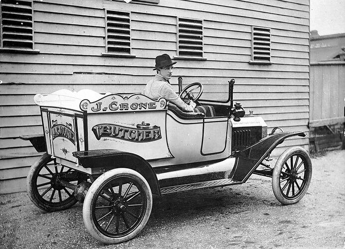 A butcher in his Model T Ford. Crone 's Butcher Shop at St Arnaud is in the background.