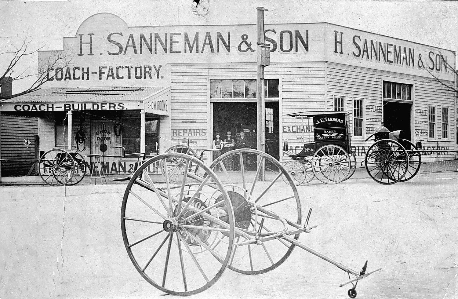 Workers outside the H. Sanneman & Son coach factory & showrooms, Bendigo. There are a number of vehicles on display and the one in the foreground appears to be a reel and may have been fire brigade equipment.