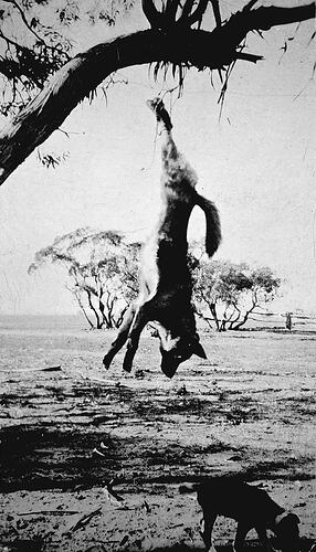 A dead dingo hanging from a tree.