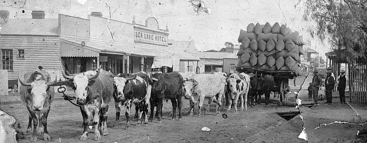 A bullock team pulling a load of wheat. The Sea Lake Hotel is in the background.
