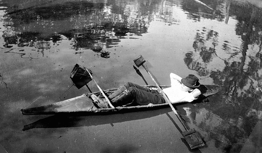 Black and white negative of Hallett Thomas in a canoe which he built at Halcyon homestead, Mount Eliza, 1922. He is on a dam which supplied water for domestic use.